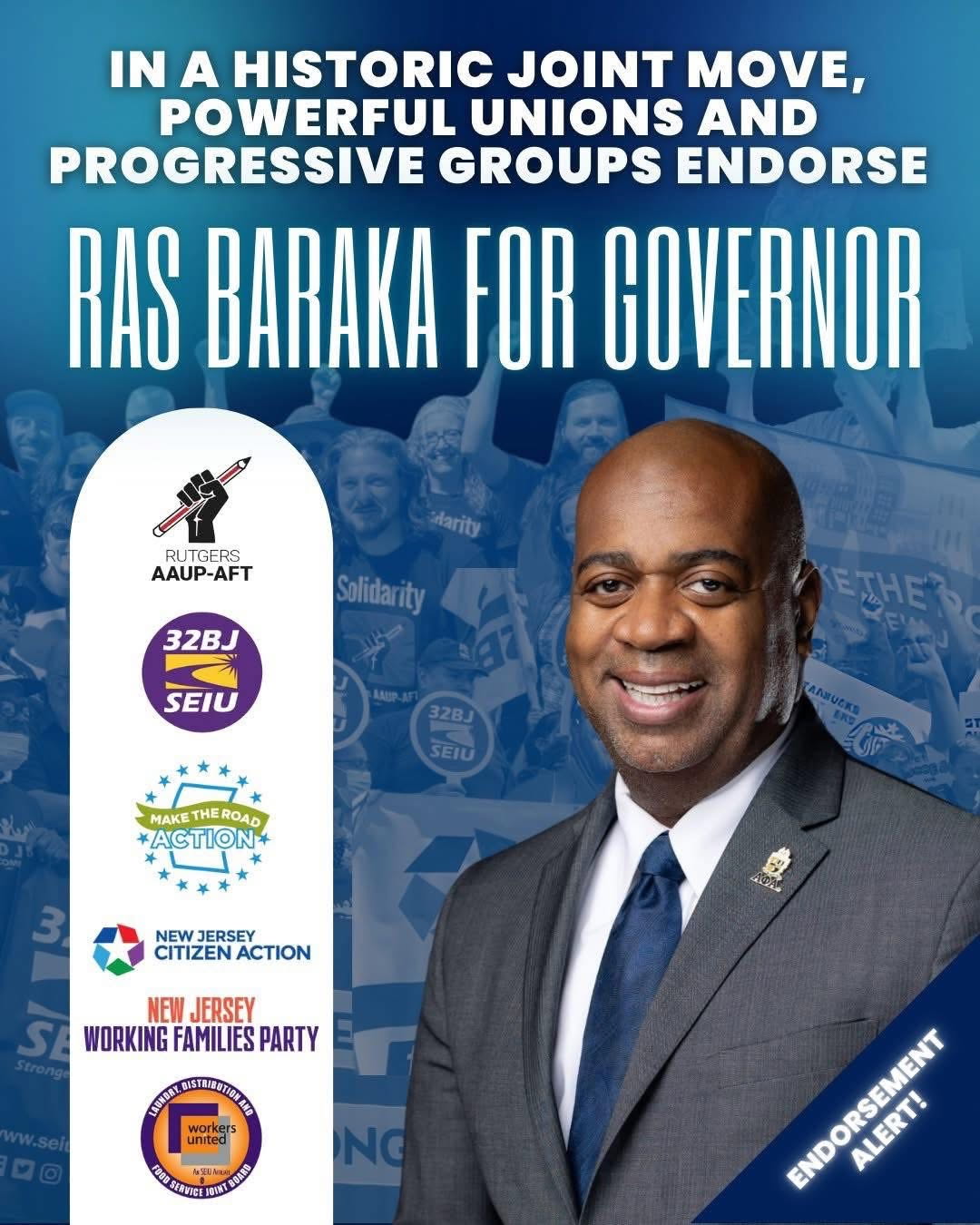 Rutgers AAUP-AFT, 32BJ SEIU, New Jersey Citizen Action, Make the Road Action New Jersey, New Jersey Working Families Party and Workers United LDFS Joint Board are throwing their support behind Baraka.