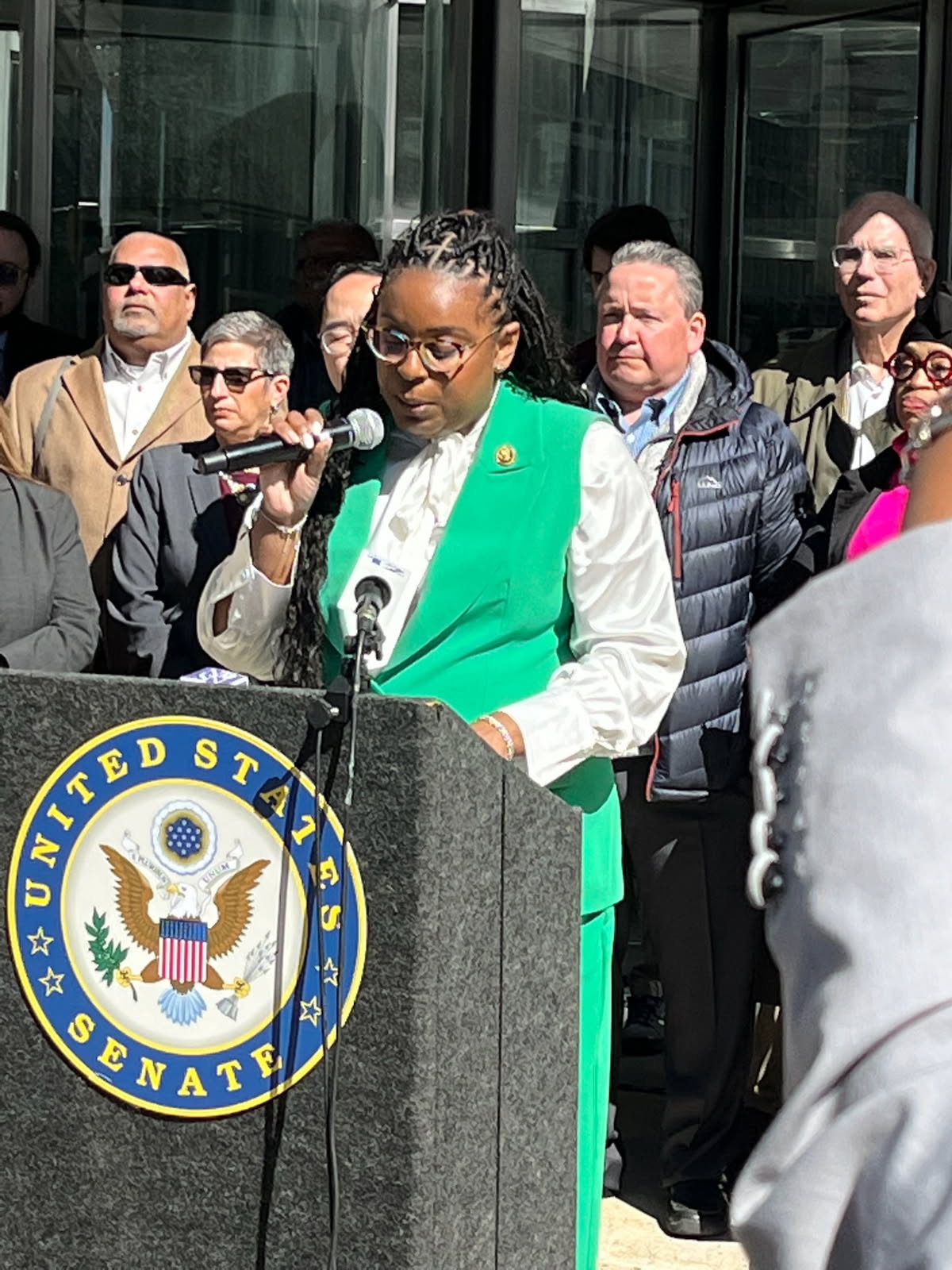 Kim spoke Tuesday at a sidewalk rally to condemn how Trump and Elon Musk are dismantling the federal government. The senator was joined by local Reps. Robert Menendez Jr. and LaMonica McIver.