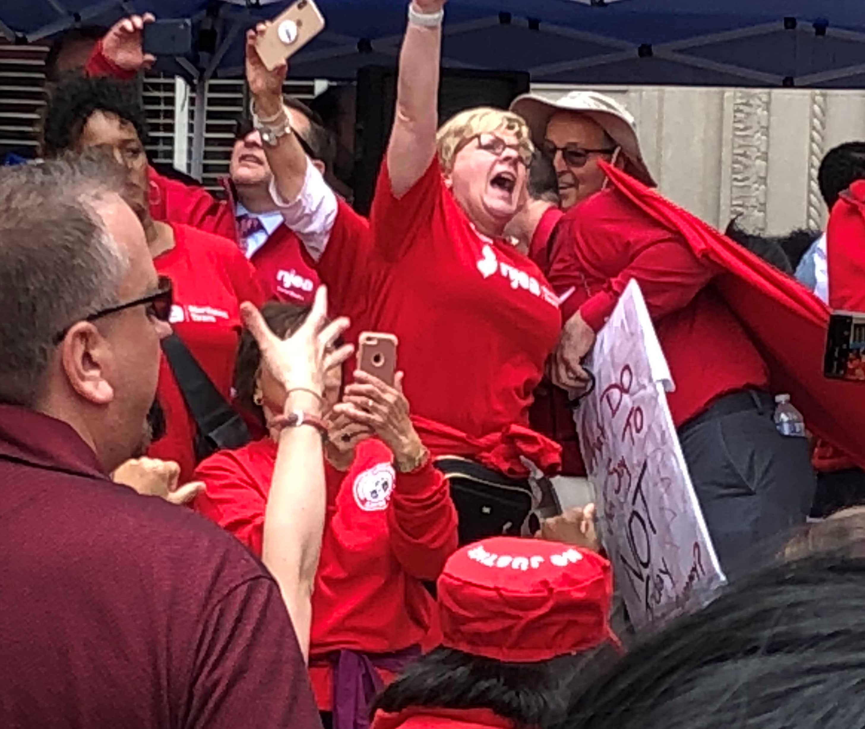 Marie Blistan, the president of the New Jersey Education Association, stressed the importance of activism, referring to a recent teachers' walkout in Franklin Lakes. How that relates to the battle over the budget and the millionaires' tax is not clear, but the remark drew a lot of cheers.