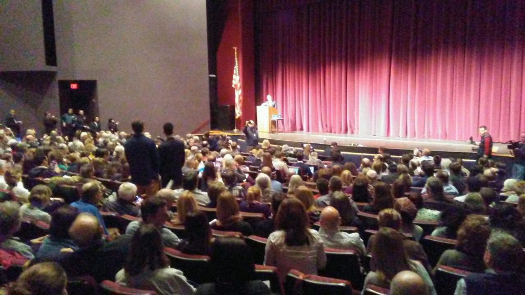 In a political atmosphere opposite 2010 when the Tea Party lambasted Democrats at town halls over the Affordable Care Act, Congressman Leonard Lance (7th District) was met with early hostility as he held his town hall event tonight at Raritan Valley Community College. With hundreds of protesters outside, the crowd filling the room was just as hostile. The mood was set when they saluted the flag, and the crowd put a big brazen exclamation point on, "and justice FOR ALL!!". Lance responded, meekly, "I agree", at which the crowd groaned and laughed.
