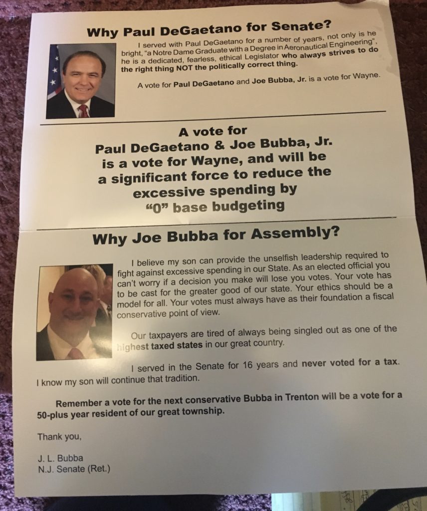 An LD40 mailer (pictured above) that contains the endorsement of former state Senator J.L. Bubba for his son and Bergen County Republican Chairman Paul DiGaetano misspells the name "DiGaetano" and neglects to mention the third candidate on the DiGaetano-Bubba team.