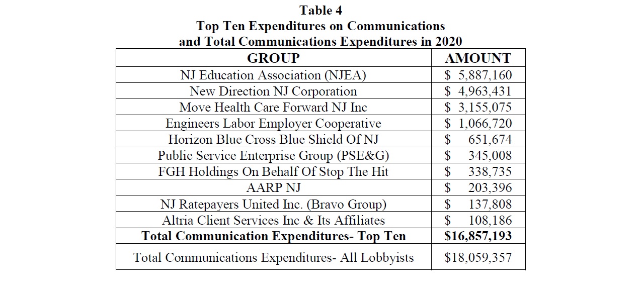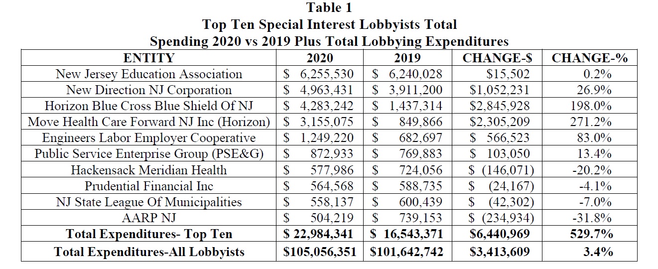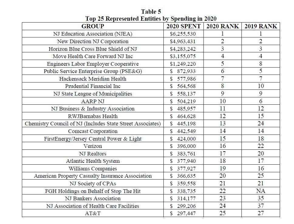 The analysis reflects a review of reports received as of 5 pm March 5, 2021. In New Jersey, lobbyists who raise or spend more than $2,500 were required to file a report on February 15ᵗʰ that reflects activity from the prior calendar year.