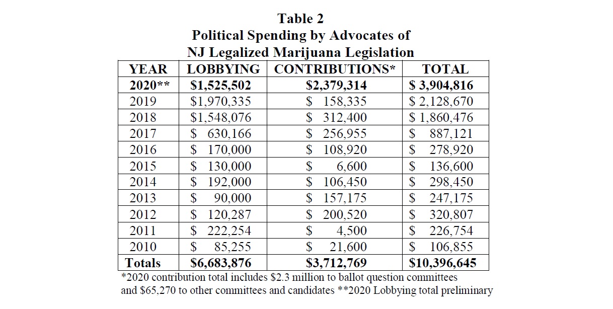 “Supporters of legalized marijuana in New Jersey have invested about $6.7 million on lobbying and $3.7 million on contributions since 2010- a total of more than $10 million.” said Brindle. “Obviously, their investment paid off since the state has enacted two medical marijuana laws, a decriminalization bill and a broader legalization bill along with other related legislation.”