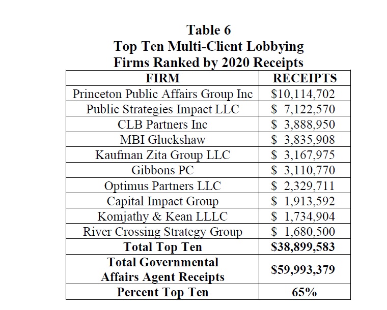 For the second straight year, lobbyists reported a record number of clients- 2,272- up 2 percent from 2019. Of the nearly $60 million in reported receipts by 78 governmental affairs agents (lobbyists), $38.9 million - 65 percent- went to the top ten multi-client firms.