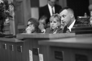 Roman stands with the senator/sitting chairman, just as Brown stands on the other side of the divide, with the mayor.