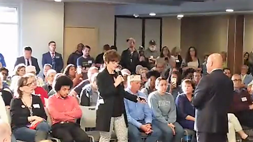 MacArthur tried to restore order as attendees of the town hall blistered back and forth.