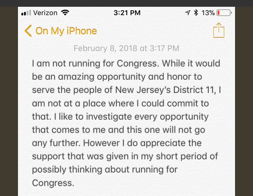 He tweeted this today in response to queries about his interest in the seat being vacated at the end of this year by U.S. Rep. Rodney Frelinghuysen (R-11):