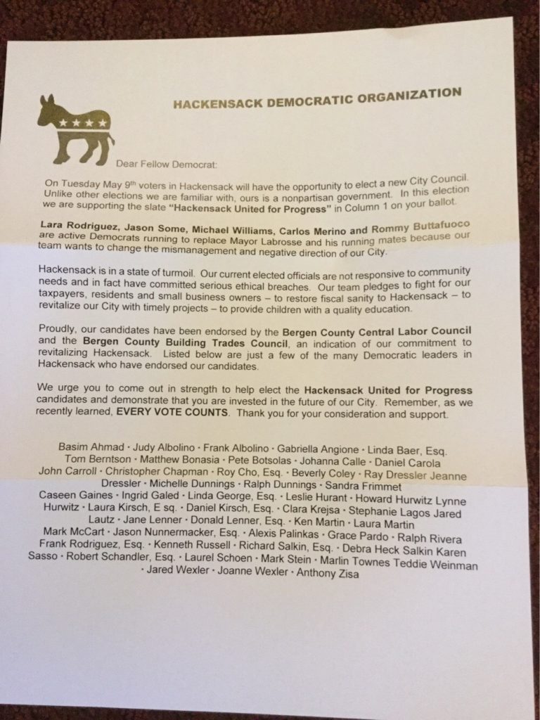 An endorsement letter from local party chair Lynn Hurwitz and some Hackensack Democrats supporting the United for Progress ticket featured one small but significant issue: