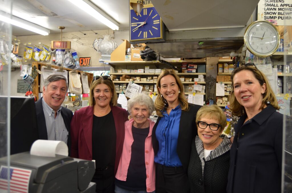 U.S. Rep. Mikie Sherrill (D-11) toured downtown Millburn today as part of a district wide walking tour in a build up to the Nov. 8 election.Millburn Township is a new addition to her 11th Congressional District and the two term Congresswoman was greeted by Millburn mayor Maggee Miggins (right) and (left) local candidates for the Township Committee Michael Cohen and Annette Romano.Flanking the Congresswoman are Marlene and Madeline Hawes owners of Buncher’s Hardware Store which is celebrating its 100 Anniversary in the downtown business center.