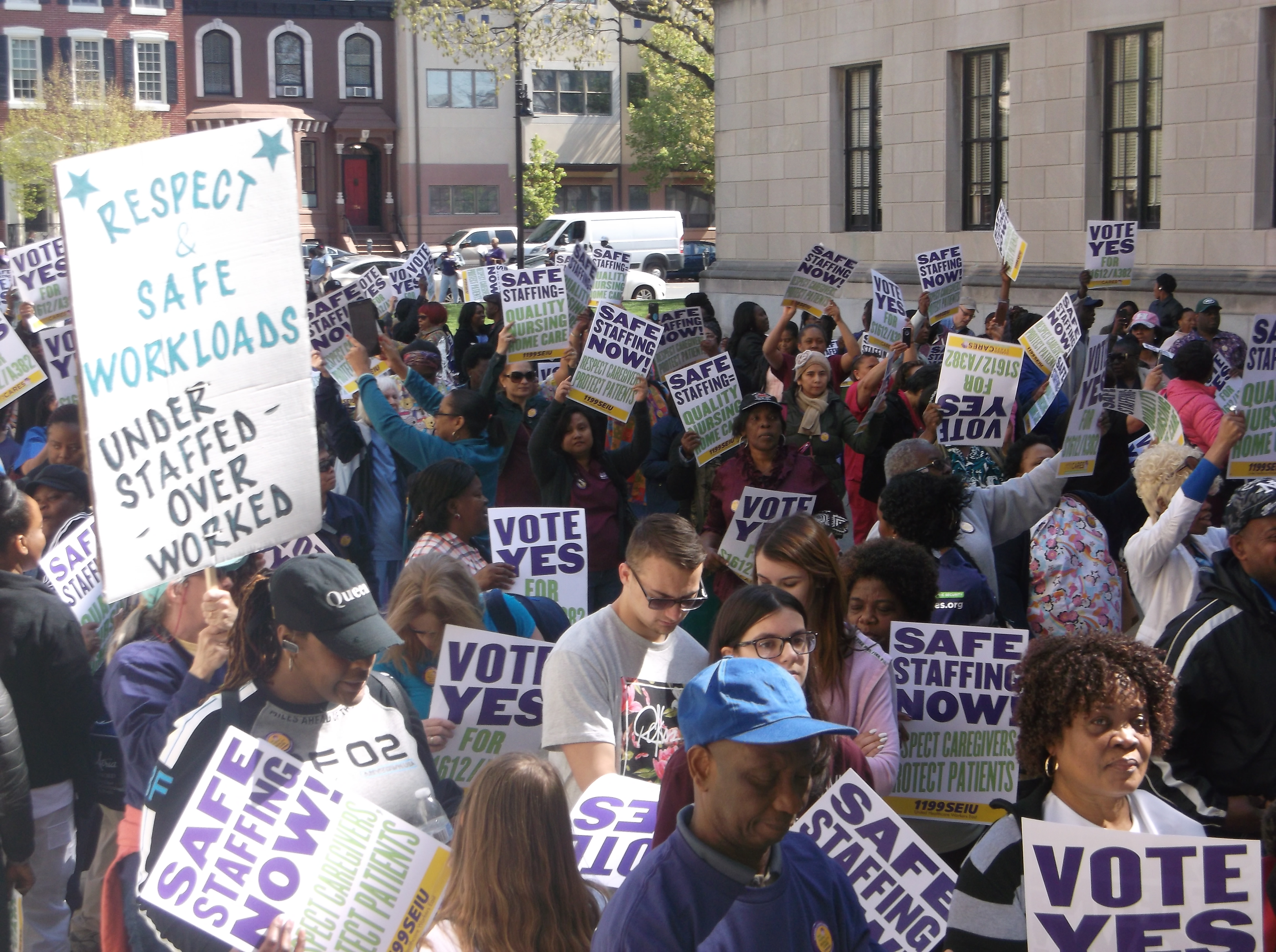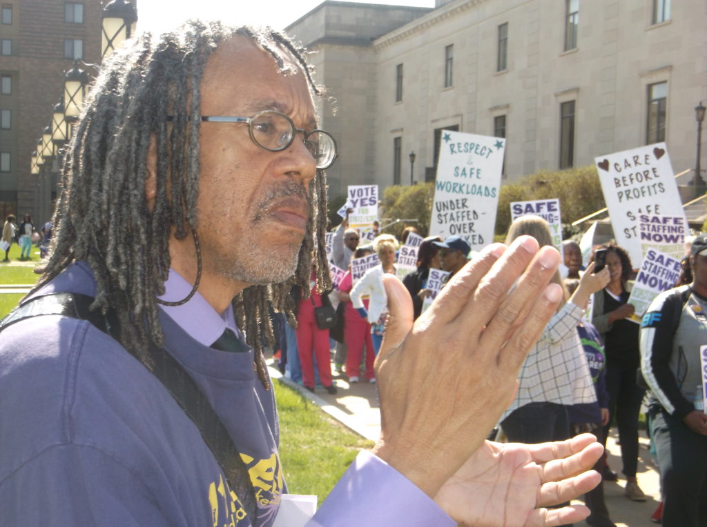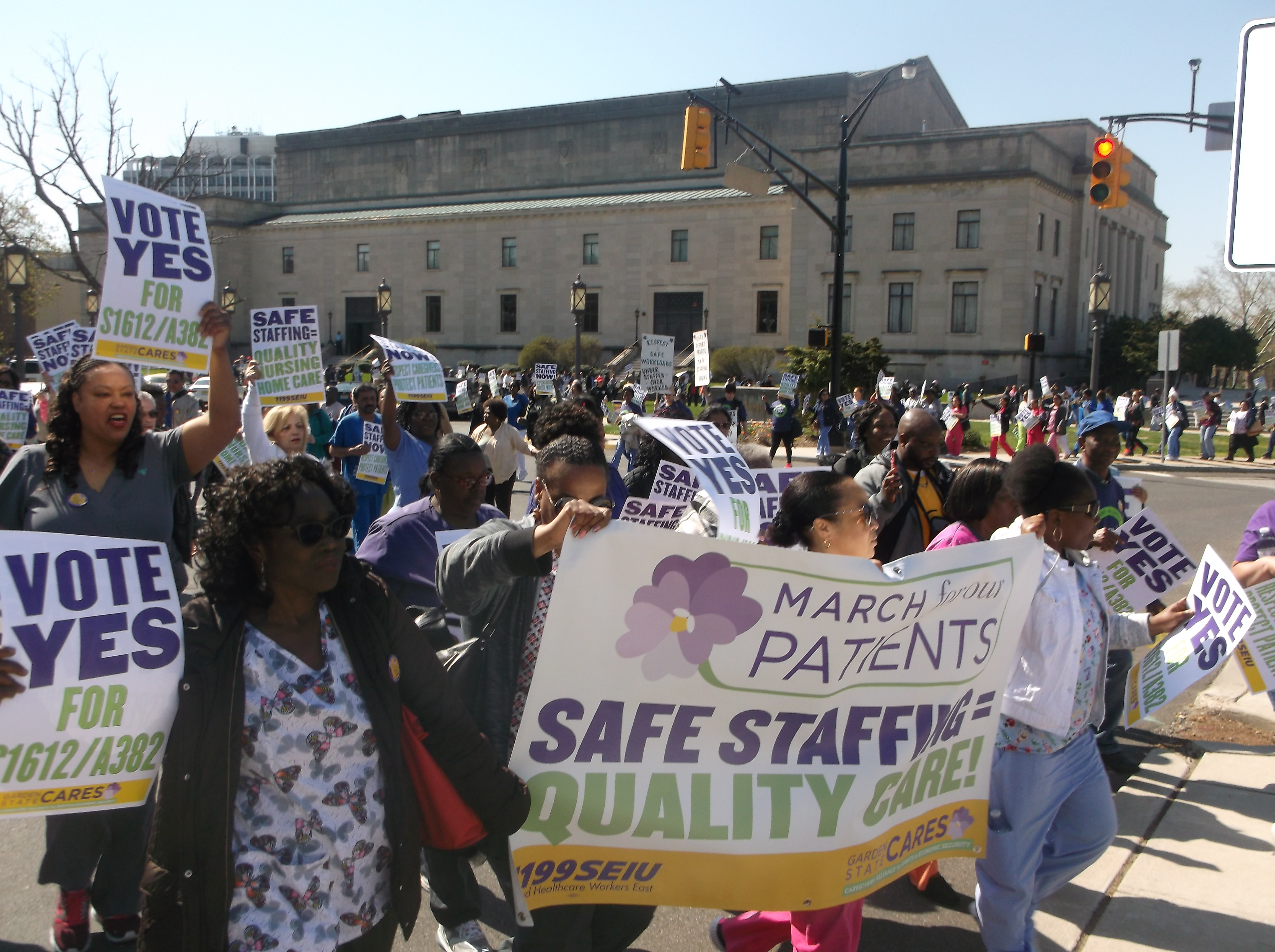 They were literally playing his song as the working members of 1199SEIU turned the corner and made their way into the courtyard of the Statehouse Annex to demand passage of S1612/A382, which would require one to eight caregiver to patient ratios in this state.
