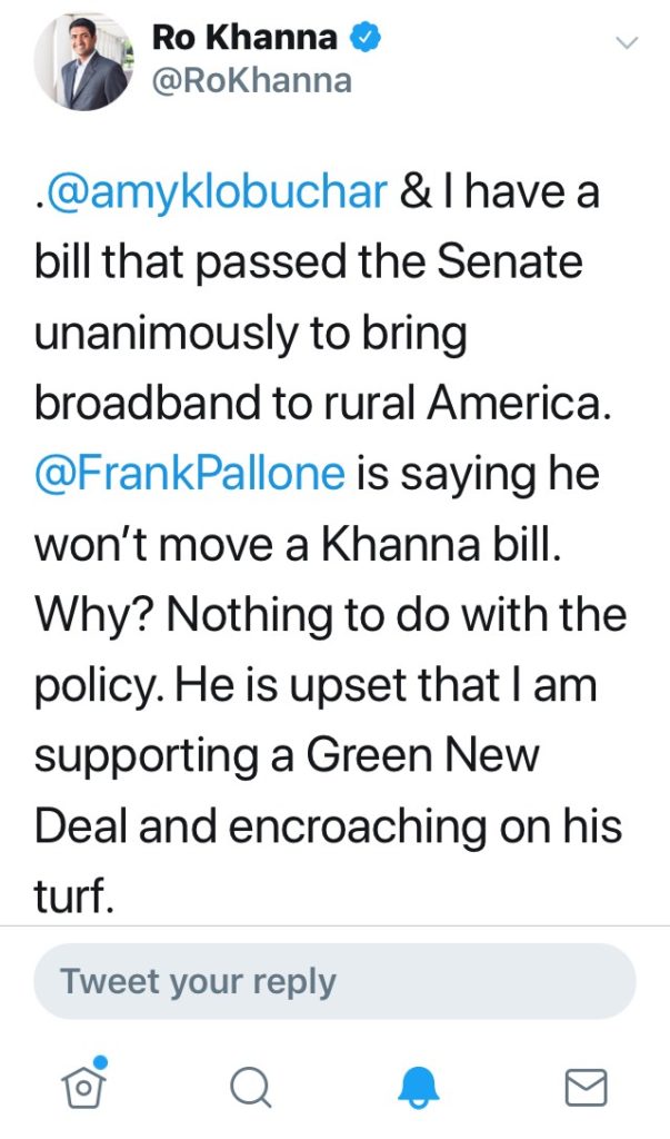 “Frank Pallone is saying he won’t move a Khanna bill,” Khanna later Tweeted. “Why? Nothing to do with the policy. He is upset that I am supporting a Green New Deal and encroaching on his turf.”