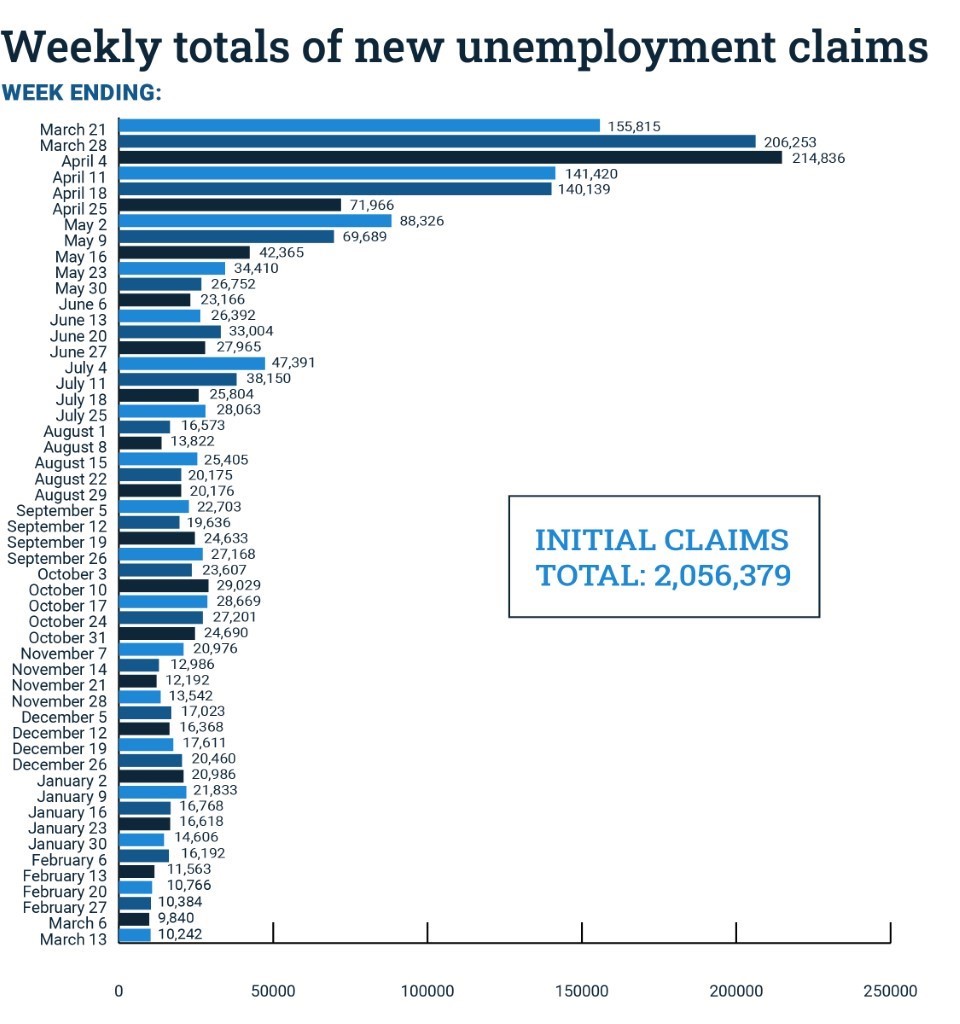 For the week ending March 13, new unemployment applications increased by 402, to 10,242 for the week, a 4.4 percent rise, after four consecutive weeks of declines. Last week, new claims dipped below 10,000 for the first time in a year. It was at this time one year ago that NJDOL experienced the start of an onslaught of new claims unlike anything previously imagined. A total of 2,056,379** unemployment claims have been received since.