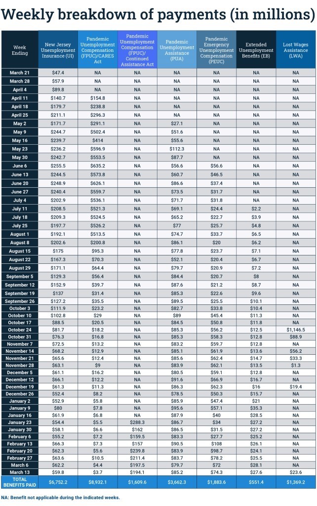 Here is the breakdown of weekly benefits payments to eligible New Jersey workers: