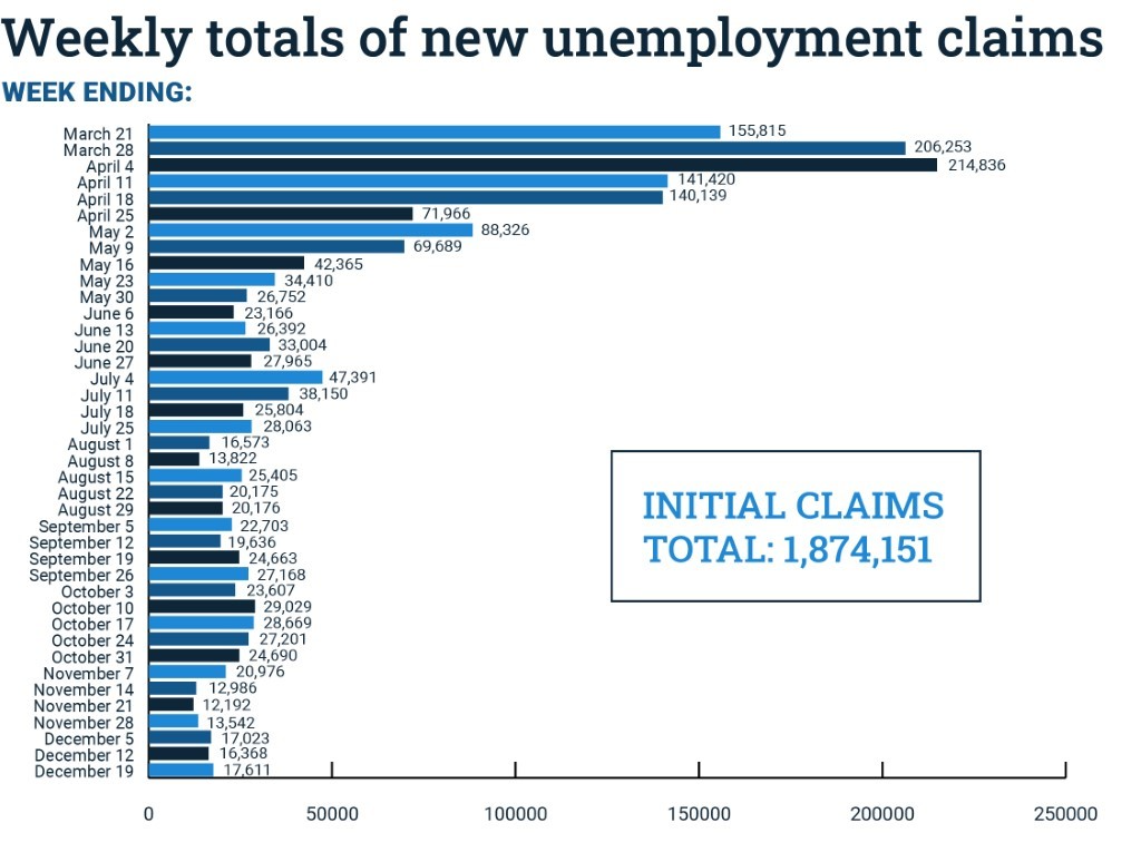For the week ending Dec. 19, the Department saw 17,611* new unemployment claims, an increase of 1,243 (7.6 percent) from the prior week, driven largely by a bump in construction claims because of the snow. The Department has received 1.87 million unemployment applications since COVID-19 took hold in mid-March; that figure includes closed claims that were later reopened.