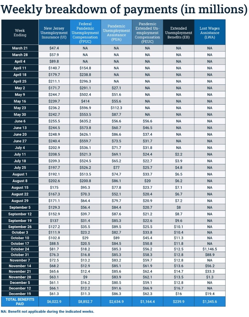 Here is the breakdown of weekly benefits payments to eligible New Jersey workers: