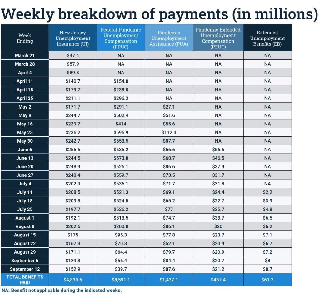 NJDOL paid out $310 million to eligible claimants for the week ending Sept. 12. A total of $15.4 billion in federal and state unemployment benefits has been distributed to unemployed New Jersey workers since mid-March.
