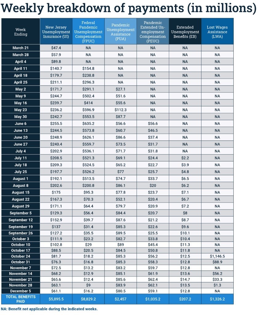 Here is the breakdown of weekly benefits payments to eligible New Jersey workers: