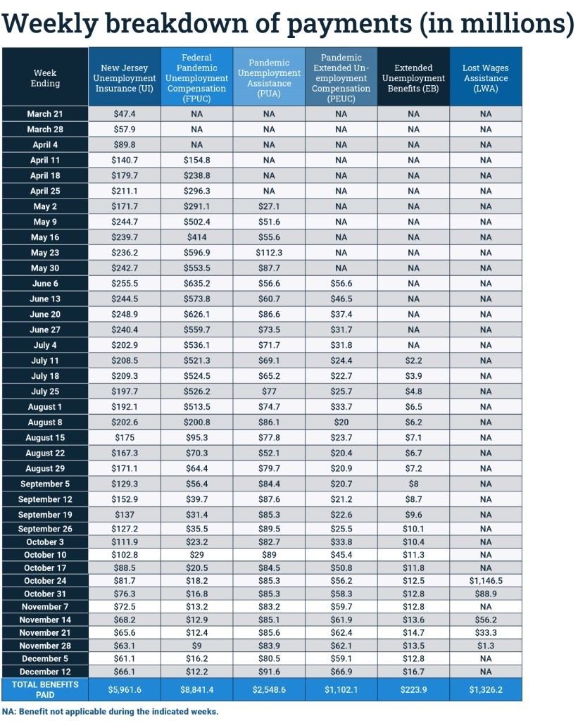Here is the breakdown of weekly benefits payments to eligible New Jersey workers: