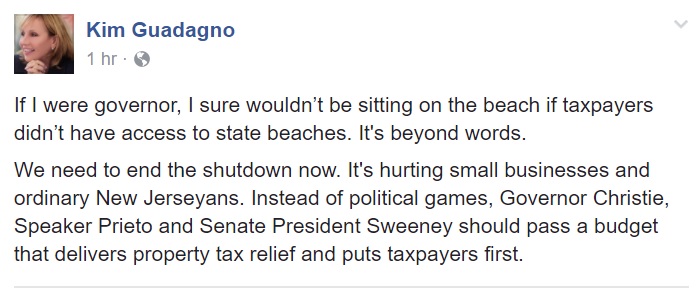 Guadagno added that "we need to end the shutdown now. It's hurting small businesses and ordinary New Jerseyans. Instead of political games, Governor Christie, Speaker Prieto and Senate President Sweeney should pass a budget that delivers property tax relief and puts taxpayers first."