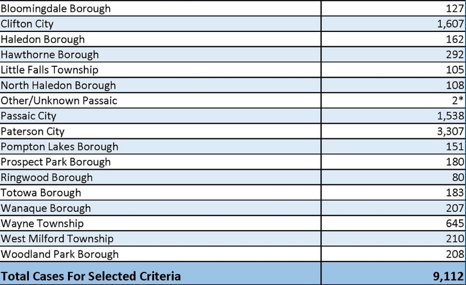 Paterson has 3,303 cases, while Clifton has 1,607 cases and Passaic has 1,538.