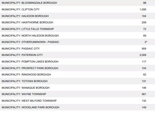 Two cities in the county have surpassed 1,000 cases: Clifton (1,006) and Paterson (2,009); Passaic City has 909 cases.