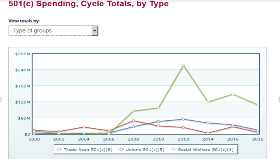 However, the fact remains that the vast majority of undisclosed spending at the federal level has been by 501c4 groups, according to the Center for Responsive Politics (see chart below).