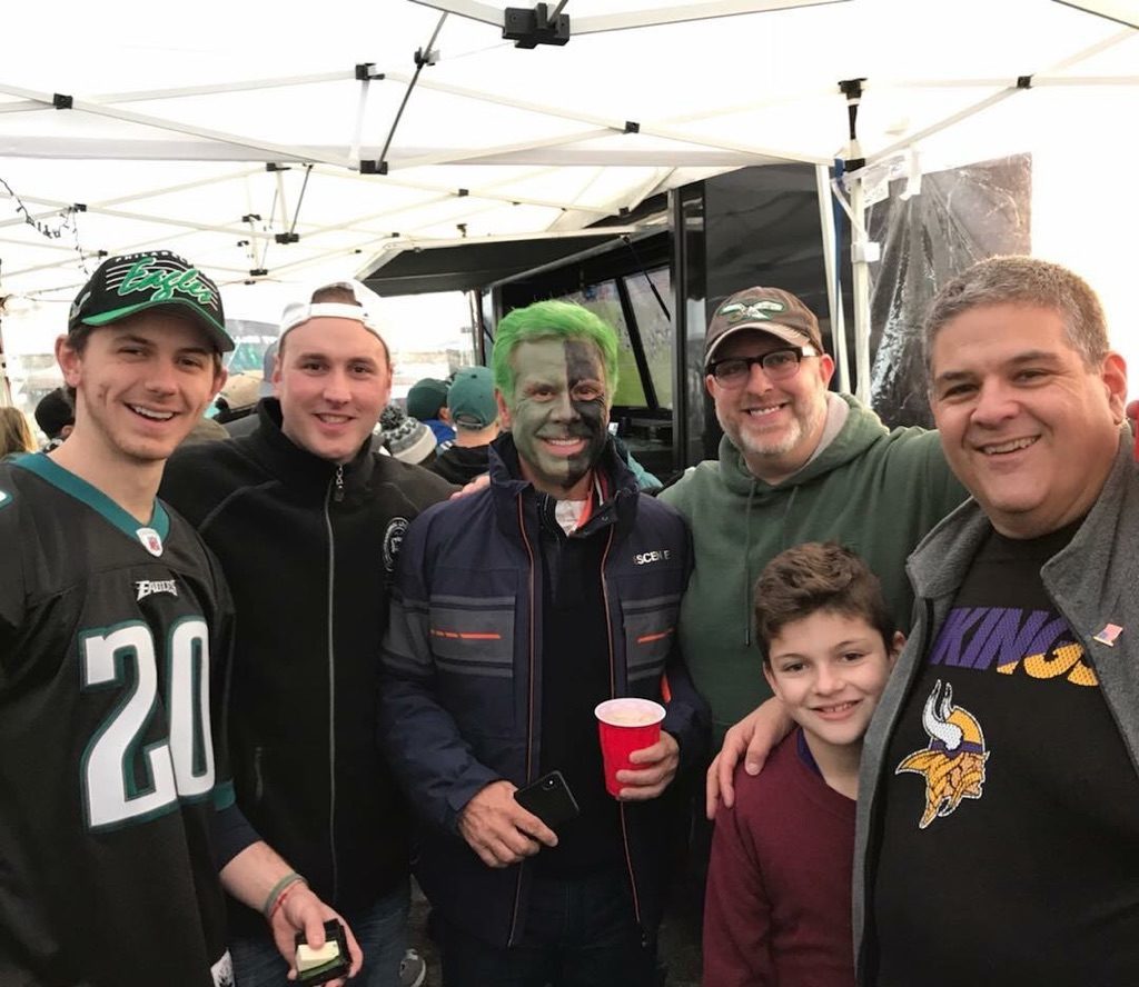 A Philly-warpainted South Jersey power broker George Norcross III (Center) prepares for the Eagles v. Vikings, with Vikes fan Phil Alagia (right), the chief of staff to Essex County Executive Joe DiVincenzo, South Jersey operative Steve Ayscue, and Essex County Freeholder Len Luciano.