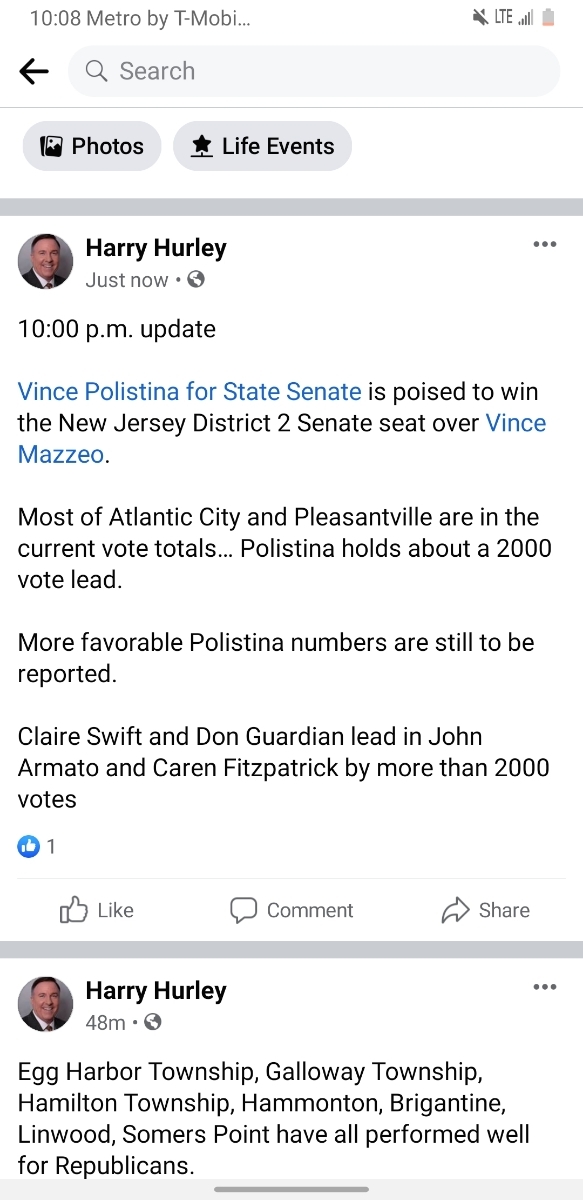 It was a win in his second attempt for Polistina, who in 2011 ran against the late state Senator Jim Whelan (D-2), only to fall short, 53-47%.