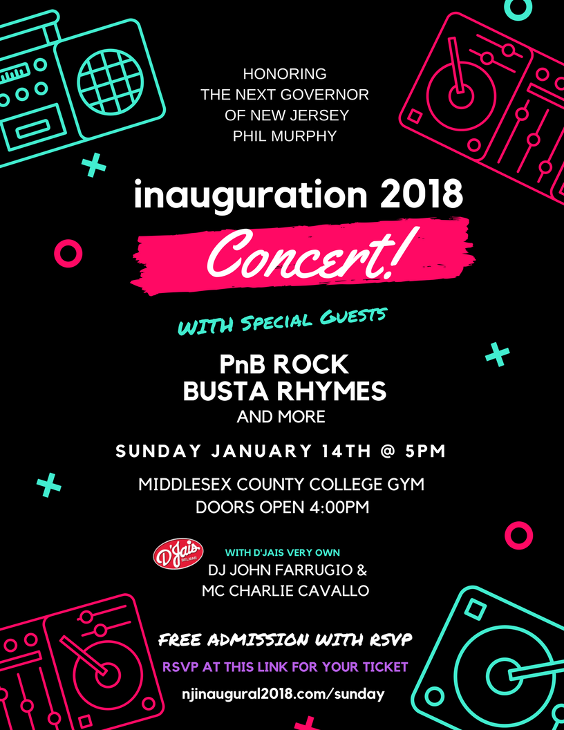 Don't miss the 2018 Inauguration Concert honoring Phil Murphy, the next Governor of New Jersey, THIS SUNDAY at Middlesex County College with special guests PnB Rock, Busta Rhymes, The Paper Mill Playhouse Broadway Show Choir, Bobby Bandier Former NY Giant Charles Way, Former NJ Devil Jim Dowd, and more!