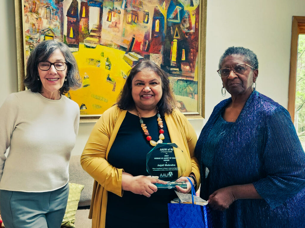 The AAUW NJ Woman as Agent of Change Award is granted annually to a New Jersey woman who has worked to assist women in their endeavors to reach their true potential; demonstrated leadership in supporting the empowerment of women; and continues to strive to reform political, economic, or social arenas in support of women. Past recipients have included Congresswoman Mikie Sherrill; Dr. Jacquelyn Litt, Dean of Douglass College at Rutgers University; Jeannine LaRue, lobbyist and policy advisor who worked to convene the first New Jersey Women’s Summit in 1993, now the New Jersey Governor’s Conference for Women; and Laurel Brennan, the Secretary-Treasurer of the New Jersey State AFL-CIO. Ms. Mehrotra will address the members of AAUW NJ at their annual meeting on April 29, 2023.