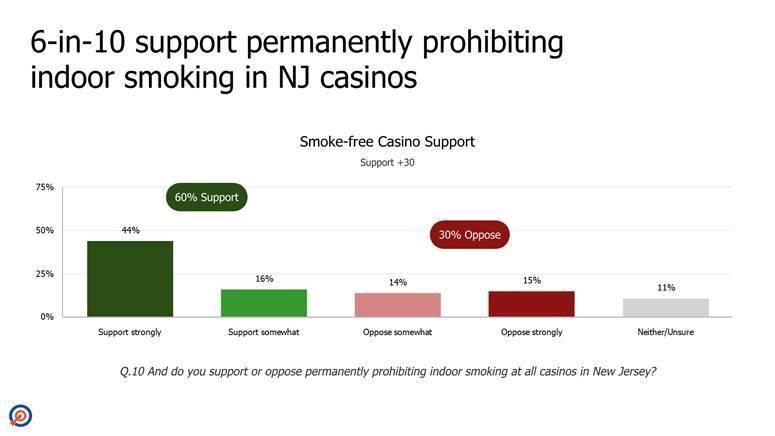 · By a 2-1 margin voters support (60%) permanently prohibiting smoking indoors at New Jersey casinos and just 30% percent oppose.