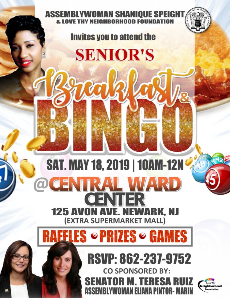 New Jersey Assemblywoman Shanique D. Speight of the 29th Legislative District and the Love Thy Neighborhood Foundation would like to invite you to the Senior’s Breakfast Bingo at the Central Ward Center Saturday May 18th, 2019 from 10:00 am to 12:00 pm. There will be prizes, raffles, and games. Assemblywoman Speight continues to be active in her legislative district as she hosts weekly events to engage with all of her constituents.