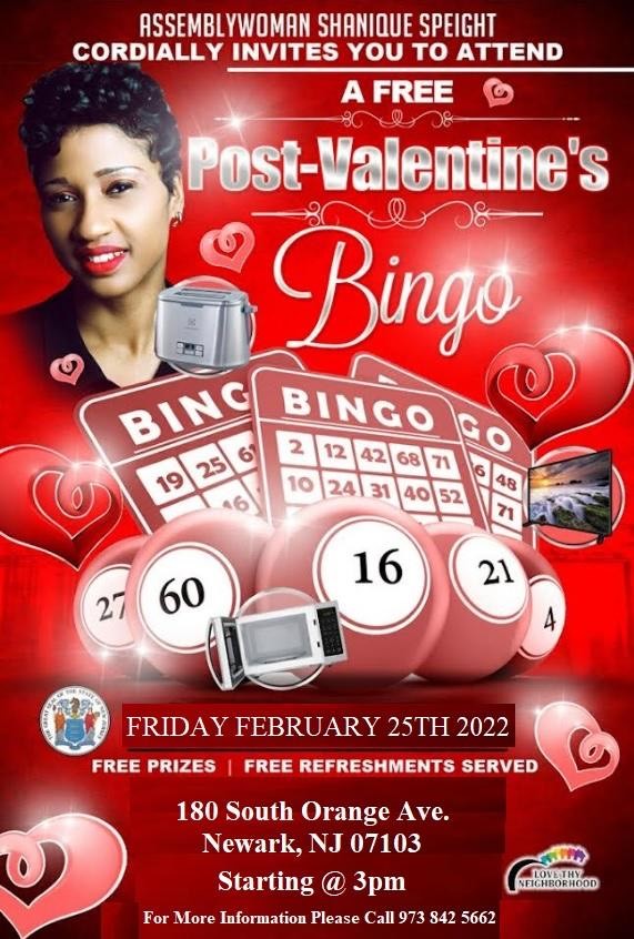 New Jersey Assemblywoman Shanique Speight invites you to a Post-Valentines Bingo today at 3pm. The event will take place at the New Community Senior Citizens building located at 180 South Orange Avenue, Newark New Jersey.