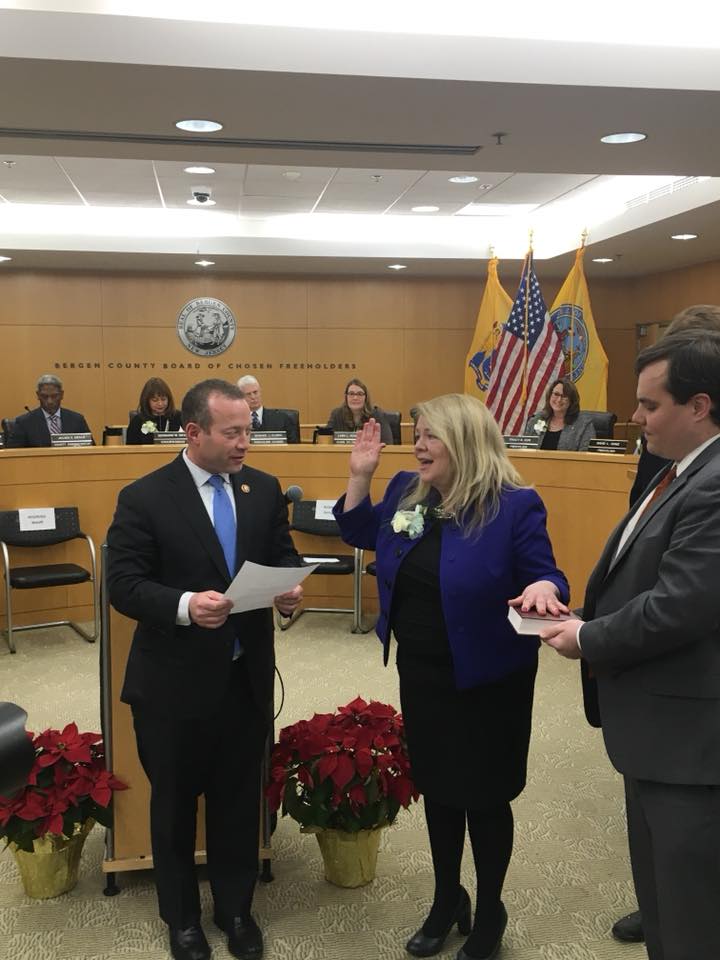 HACKENSACK- Bergen County officials last night swore in incumbents Tracy Silna Zur (D-Franklin Lakes) and Steven A. Tanelli (D-North Arlington) for their third terms at the Freeholder reorganization meeting in Hackensack last night. The two won approximately 60% of the votes in a historically purple county during the 2018 midterm elections. In addition, last night the Board chose their 2019 leadership as Germaine Ortiz (D-Emerson), Mary Amoroso (D-Mahwah), and Joan Voss (D-Fort Lee) to serve as Chairwoman, Vice-Chair, and Chair Pro Tempore respectively. Bergen is now one of two counties in the state to have an all-female leadership team. This is also the first time in the county’s history that there is a Latina Chairwoman.
