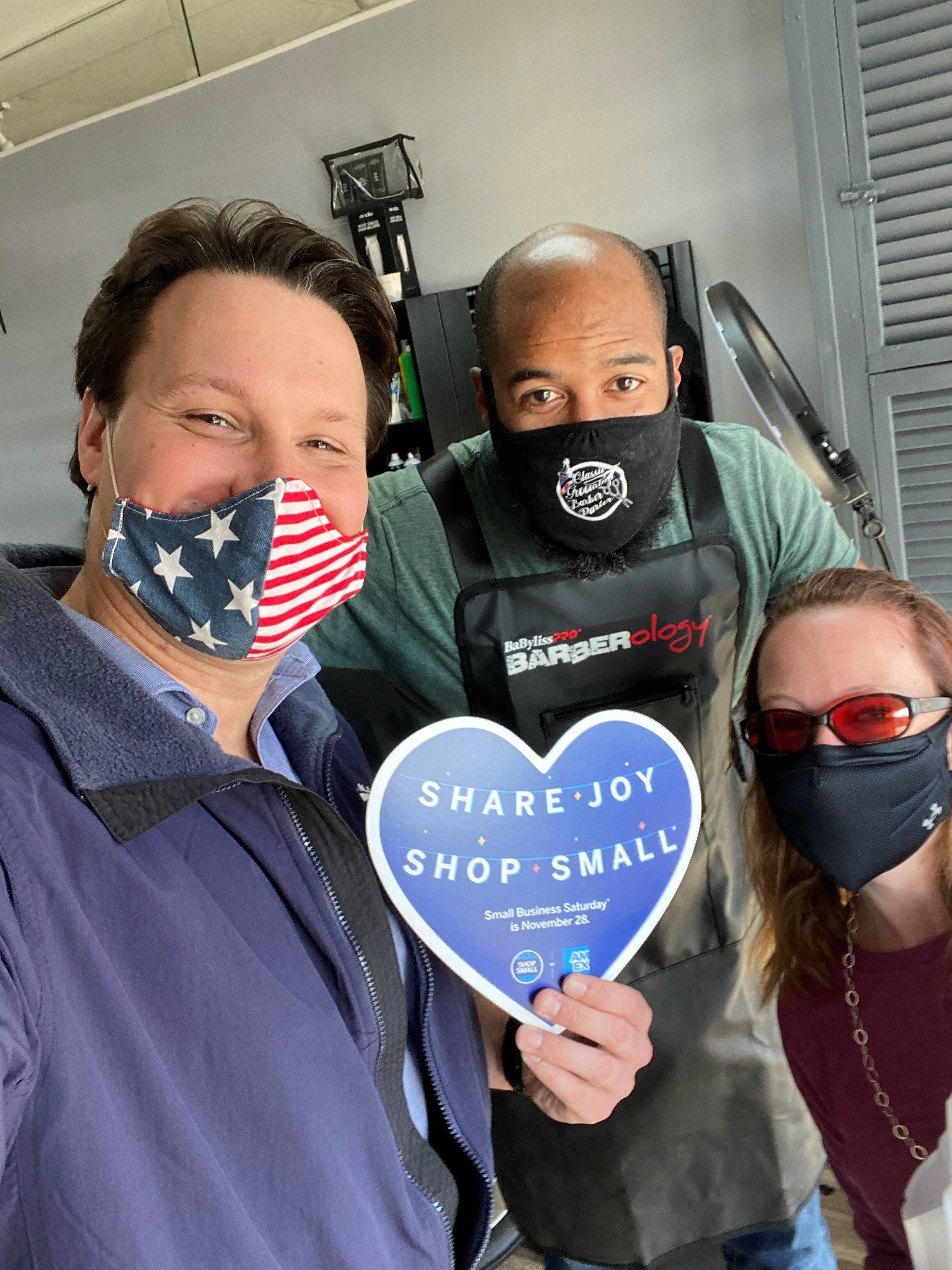 Shop Small Photo 1 Caption: (L to R): Mayor Jason Cilento, Sharif Kinney owner of Classic Grooming Barber Parlor, and Council Member Stacy Narvesen showing support for Small Business Satruday.