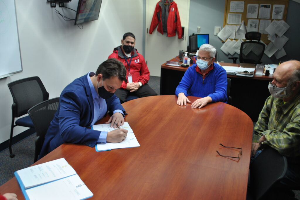 School Board President Jeff Portik signs the shared service agreement with Mayor Jason Cilento, School Business Administrator Johnny Rosa and District Superintendent Gene Mosely in attendance.