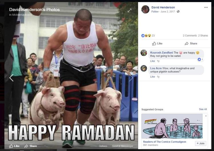 Henderson’s Facebook posts have included pictures of severed pig heads with messages such as “Sharia Law Saturday. Ha! There is no Sharia Law in America.” Another of a body builder carrying two pigs in each hand declared, “Happy Ramadan.”