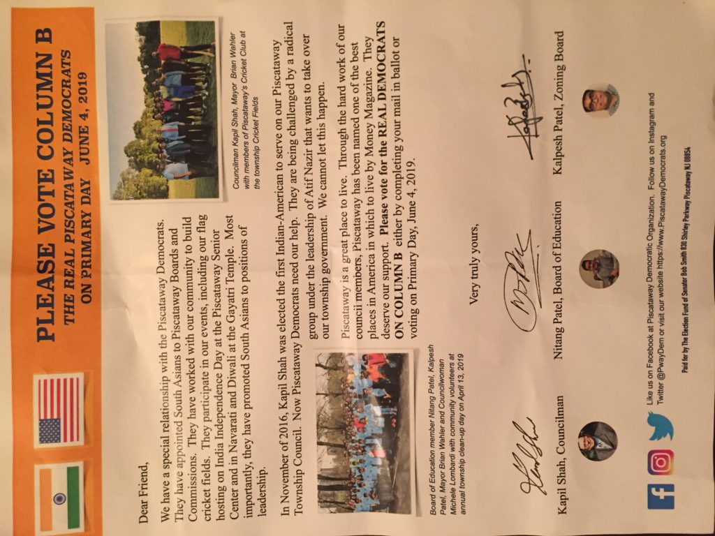 The flyer claims that local incumbent Democrats are being “challenged by a radical group under the leadership of Atif Nazir.” The flyer was targeted to Indian-American households and translated into Gujarati. It was signed by Councilman Kapil Shah, Board of Education member Nitang Patel, and Kalpesh Patel of the Zoning Board. It has “Paid for By the Election Fund of Bob Smith” on the bottom and features a photo of the Mayor, Councilwoman Michele Lombardi and children at a public, Township-sponsored community clean up event.