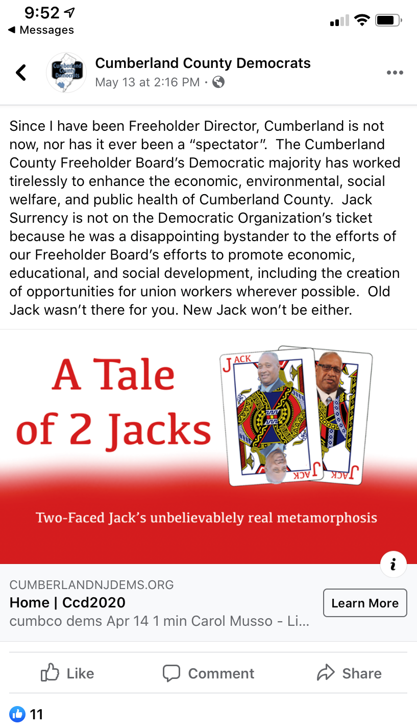 I find the 2-faced Jack Surrency ad to be quite racist. Two different color tones and faces for the only black member of the Board of Chosen Freeholders? C'mon, its 2020 and we are supposed to be better than that. Who is responsible for this ad?