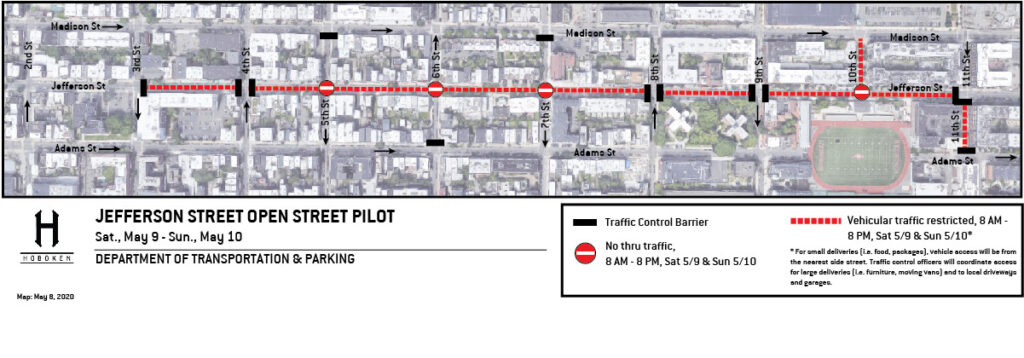 To help provide some detailed information about the setup for this weekend’s Jefferson Street open street pilot (between 3rd Street and 11th Street), our transportation team has drawn up a map with some traffic information. Please see the attached map which gives some additional detail about vehicular restrictions. The open street is designed to provide more space for residents to social distance when walking, jogging and biking, but congregating is not permitted.