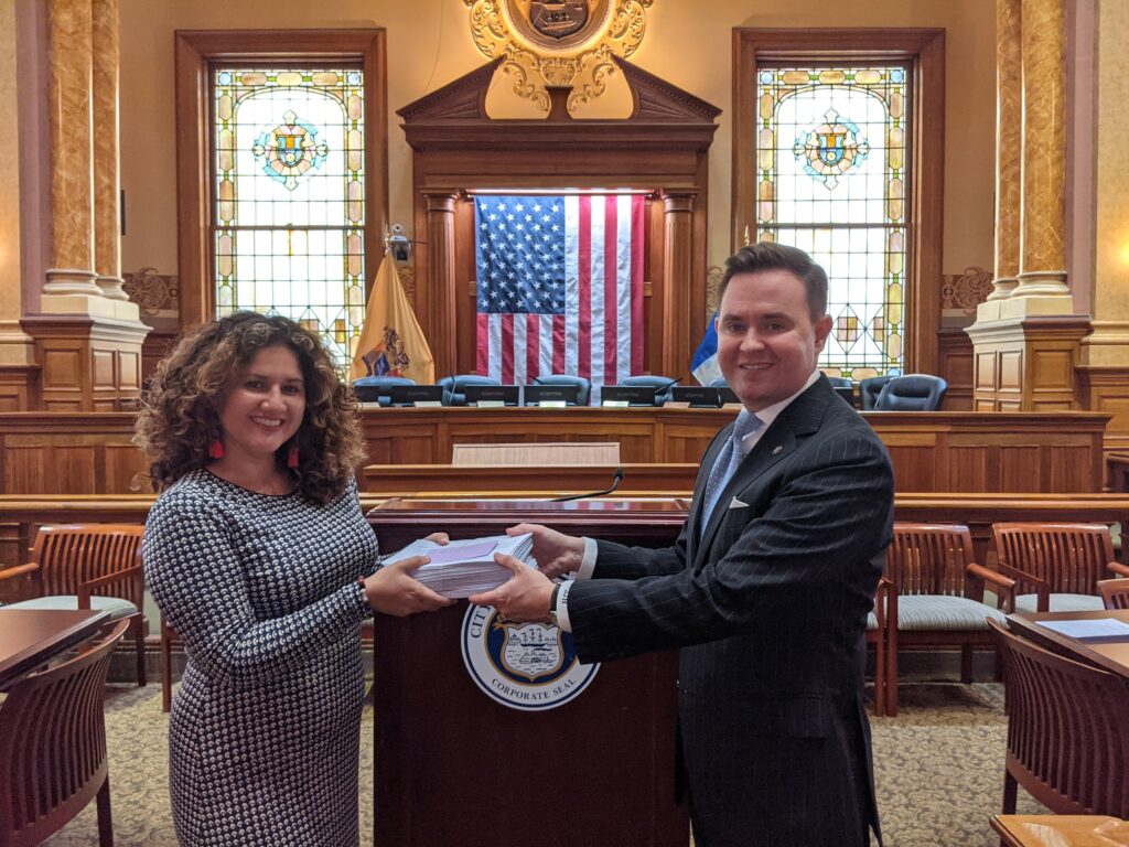 DANIELLE FREIRE, CANDIDATE FOR JERSEY CITY WARD D, PRESENTS 500 PETITIONS TO CITY CLERK FOR JERSEY CITY WARD D
