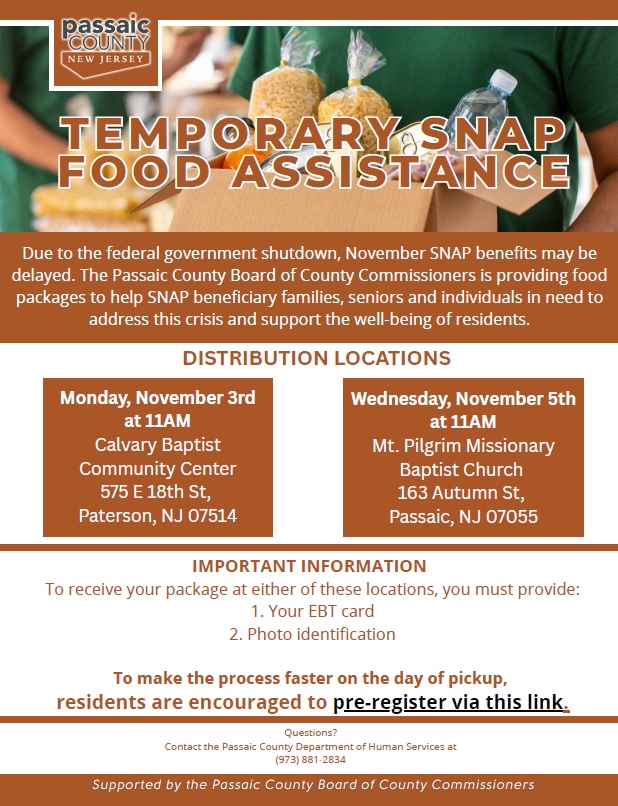 “Our team is working closely with the Passaic County Board of Commissioners to provide immediate support and notify all SNAP beneficiaries about the county’s food distribution initiative scheduled for this week,” added Talisa Coleman, Director of the Passaic County Social Services Board.