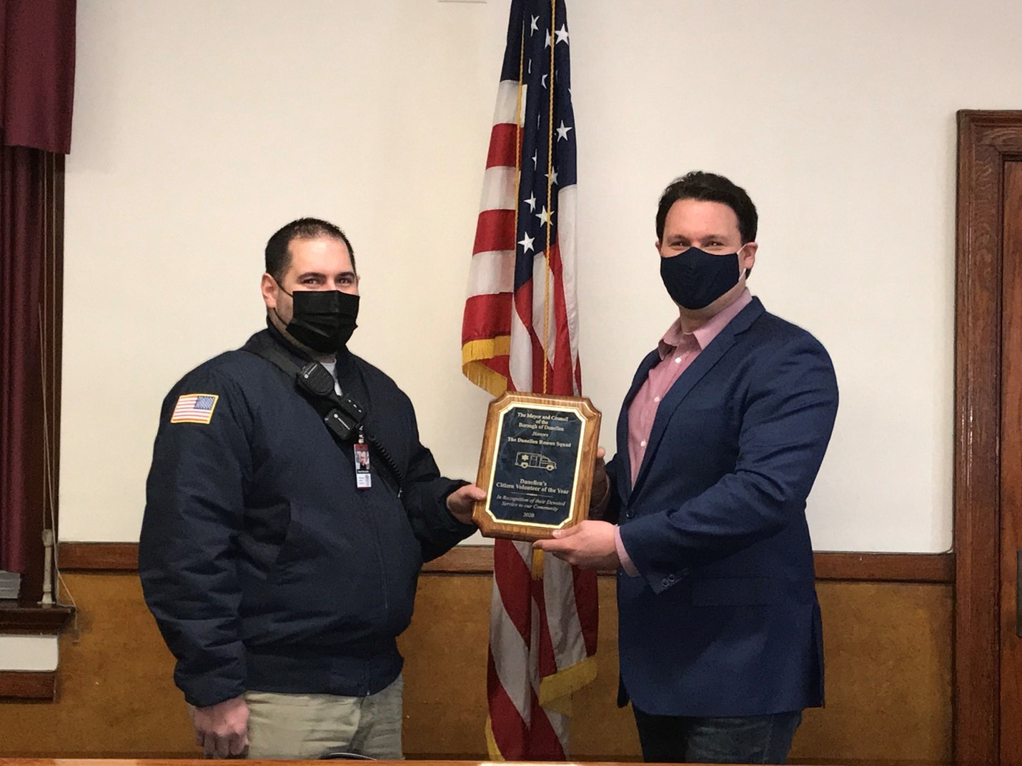 The Dunellen Rescue Squad is presented the “Dunellen’s Volunteer Citizen of the Year, 2020.” (L to R): Chief Robert Bracaloni and Mayor Jason F. Cilento.