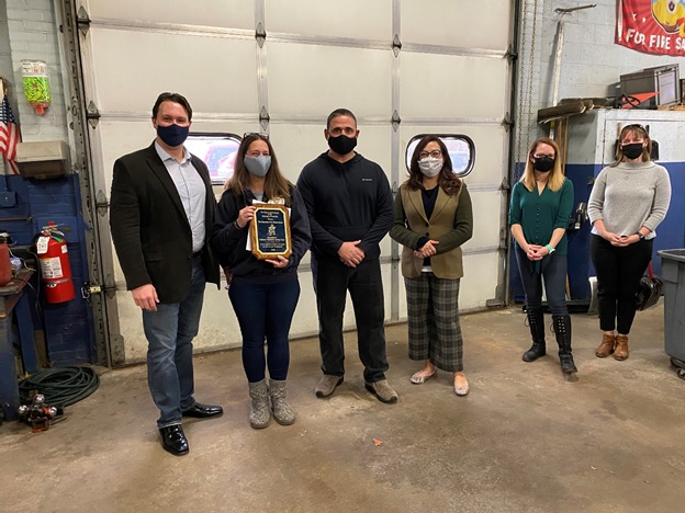 The Dunellen Fire Department is presented the “Dunellen’s Volunteer Citizen of the Year, 2020.” (L to R): Mayor Jason F. Cilento, Dunellen Fire Co. No. 1 President Sue Connolly, Fire Chief Mark Crawford, Council Member Trina Rios, Council Member Stacy Narvesen, and Council Member April Burke.