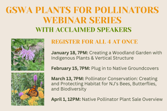 MORRISTOWN, NEW JERSEY (January 15, 2024) — Great Swamp Watershed Association (GSWA) announced today they will host four free webinars focused on native plants and the essential role pollinators play in the ecosystem. Led by nationally acclaimed experts, these monthly hourlong programs lead up to the organization’s fourth annual, online Native Plant for Pollinators program that runs April 1-19, 2024. An additional Q&A webinar is scheduled for mid-April. Registration and information can be found at GreatSwamp.org or 973-538-3500.