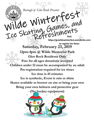 Glen Rock residents: fight the winter blues with a free event from the Borough! On Saturday, February 23rd from 12-4pm the Borough will host their first annual “Wilde Winterfest” at Wilde Memorial Park. The spotlight of this pilot program is ice skating and to manage Mother Nature’s fickle ways, a synthetic ice surface will be placed in the park’s roller rink. In addition to skating, there will be music and a variety of carnival-type games for participants to enjoy as well as hot chocolate to keep skaters warm.