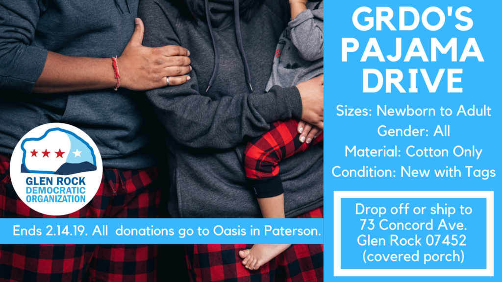 Glen Rock Democrats invite the members of the public to donate pajamas to their Pajama Drive. Between now and February 14, 2019, the non-profit organization is collecting pajamas that are sizes newborn to adult, all genders, cotton only, and new with tags. Once the collection is complete, all the pajamas will be delivered to Oasis, a Paterson based women's shelter.