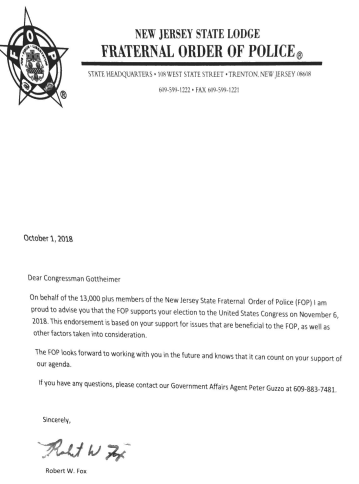 "On behalf of the 13,000 plus members of the New Jersey State Fraternal Order of Police (FOP), I am proud to advise you that the FOP supports your election to the United States Congress on November 6, 2018. This endorsement is based on your support for issues that are beneficial to the FOP, as well as other factors taken into consideration," said NJFOP President Robert W. Fox. "The FOP looks forward to working with you in the future and knows that it can count on your support of our agenda."