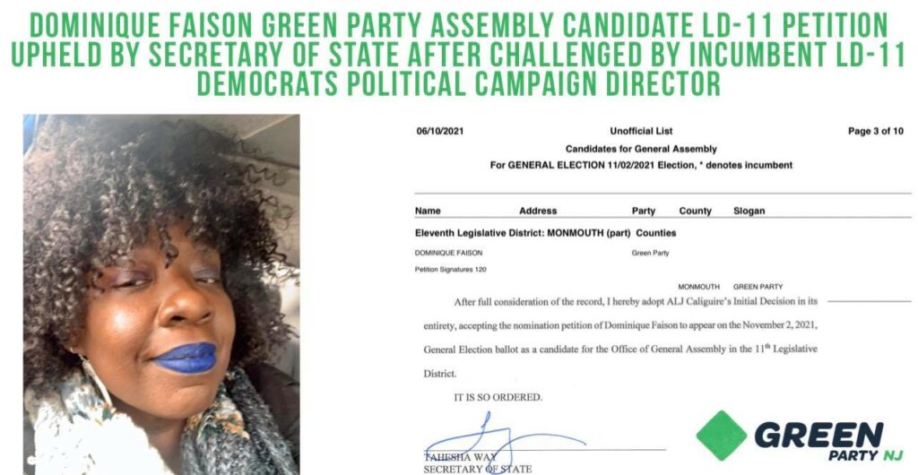 Green Party of New Jersey Statement: “Dominique Faison Green Party Assembly Candidate LD11 Petition Upheld By Secretary of State After Challenged By Incumbent LD11 Democrats Political Campaign Director”