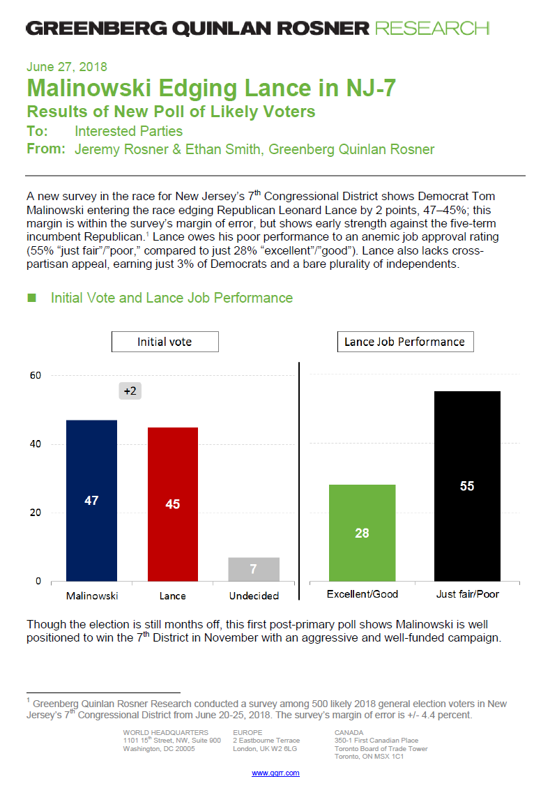 Greenberg Quinlan Rosner Poll: Malinowski Up 2 over Lance in NJ07